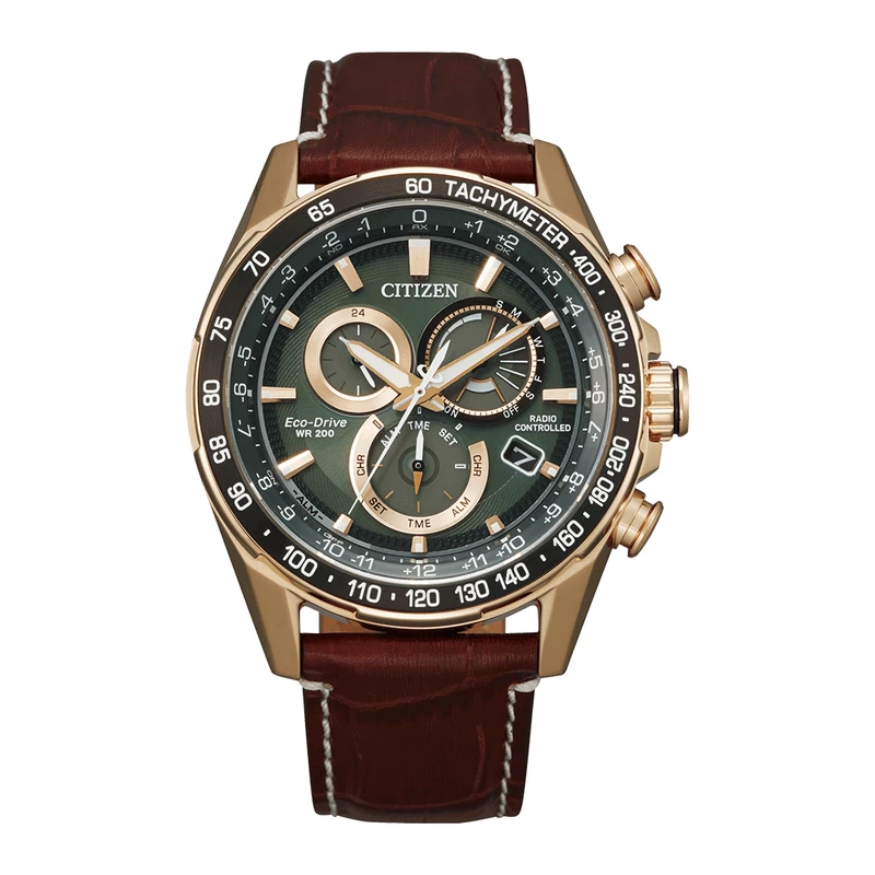 ساعت مچی مردانه سیتیزن مدل CB5919-00X به دلیل متریال درجه یک استفاده شده در طراحی آن، لایق بررسی دقیق جز به جز امکانات به کار رفته در ظاهرش است. اولین چیزی که به چشم می خورد، ترکیب رنگی دوست داشتنی سبز و قهوه ای و مسی می باشد و از ویژگی های کلی ظاهری آن نیز، طراحی صفحه نسبتا پیچیده است. اگر کمی دقیق تر به صفحه این ساعت بنگریم، صفحه های مربوط به کرونوگراف، نمایشگر ساعت شبانه روز، تقویم روزشمار، نمایشگر روزهای هفته، نمایشگر میزان شارژ ساعت، ساعت ثانویه و عقربه های شبرنگ دیده می شود که با ترکیب منظم کنار هم نشسته اند و عقربه های شب تاب نکته جذاب این ترکیب می باشد. این ساعت مچی دارای بند قهوه ای از جنس چرم طبیعی و صفحه سبز رنگ است که همه ی این ویژگی ها در کنار هم جلوه ی کلاسیک جذاب و خیره کننده به آن داده است و استایل کلاسیک آن مناسب ست شدن با لباس مجلسی و کلاسیک است.